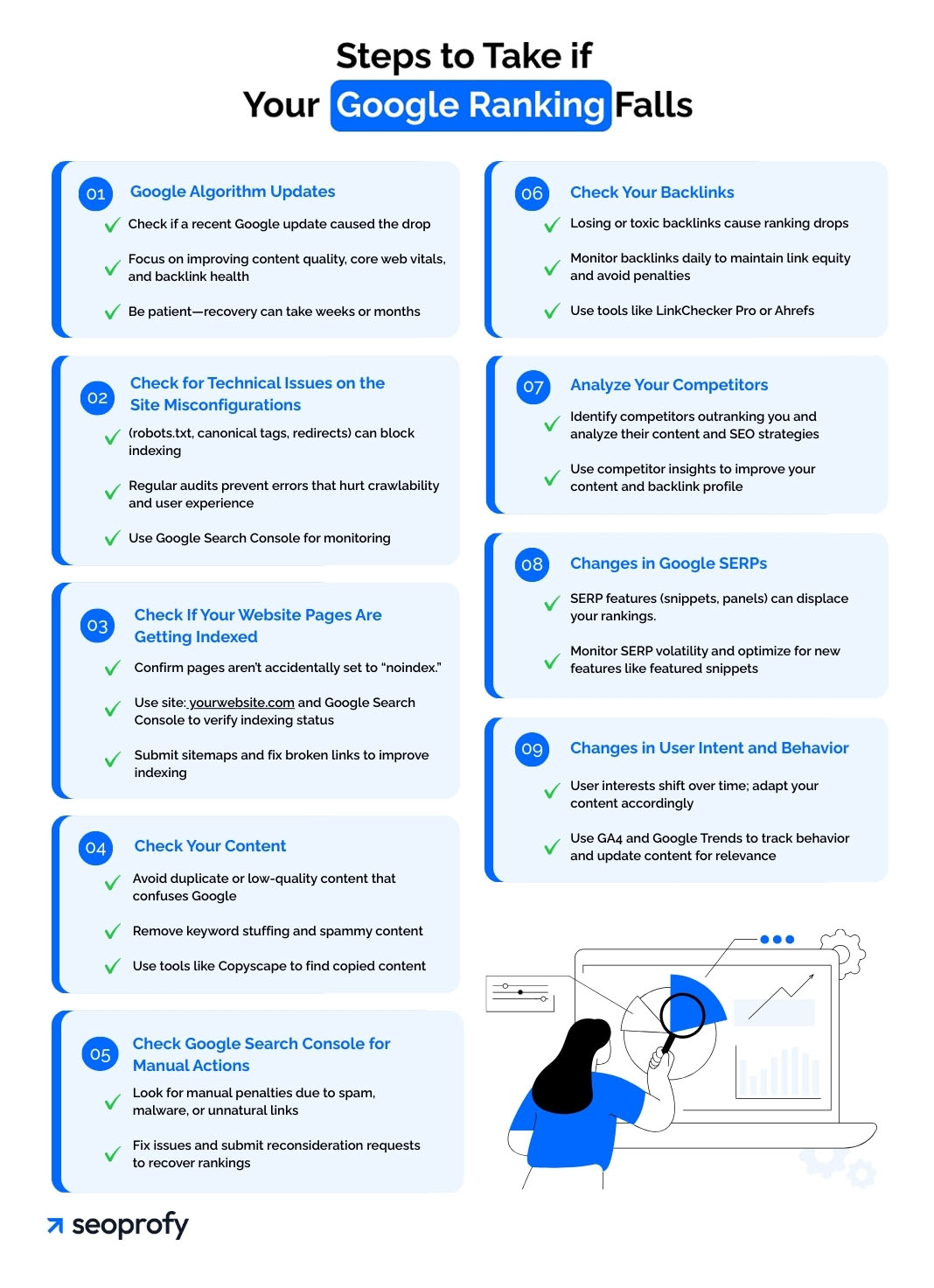 - Constantly keep an eye on your websiteâs performance. Itâll help you notice any issues ASAP and fix your SEO mistakes that have led to a ranking drop.