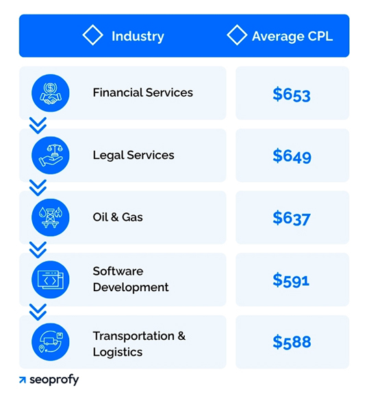 - The lowest average CPL is in the eCommerce industry, where itâs only $91. (First Page Sage)