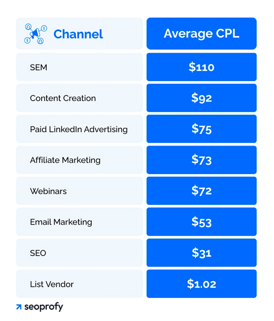 Here is a table reviewing the average CPL of other channels used by B2B marketers: