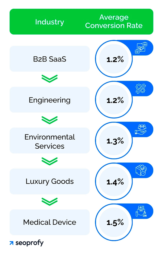 - The lowest conversion rate is in the software development industry, where itâs only 1.1%. (First Page Sage)