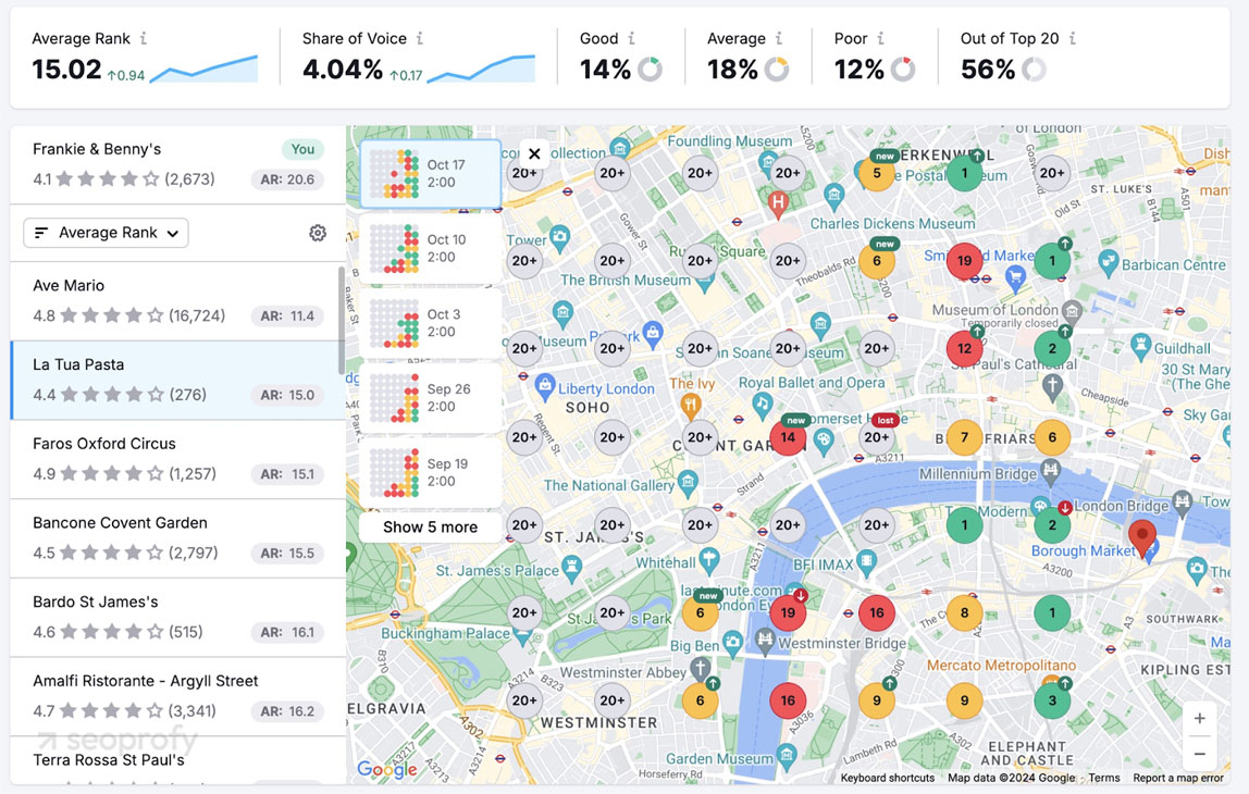 - Semrush (Map Rank Tracker): Designed with powerful AI, this tool allows you to monitor your search positions in local rankings directly on a map of the areas for certain keywords.